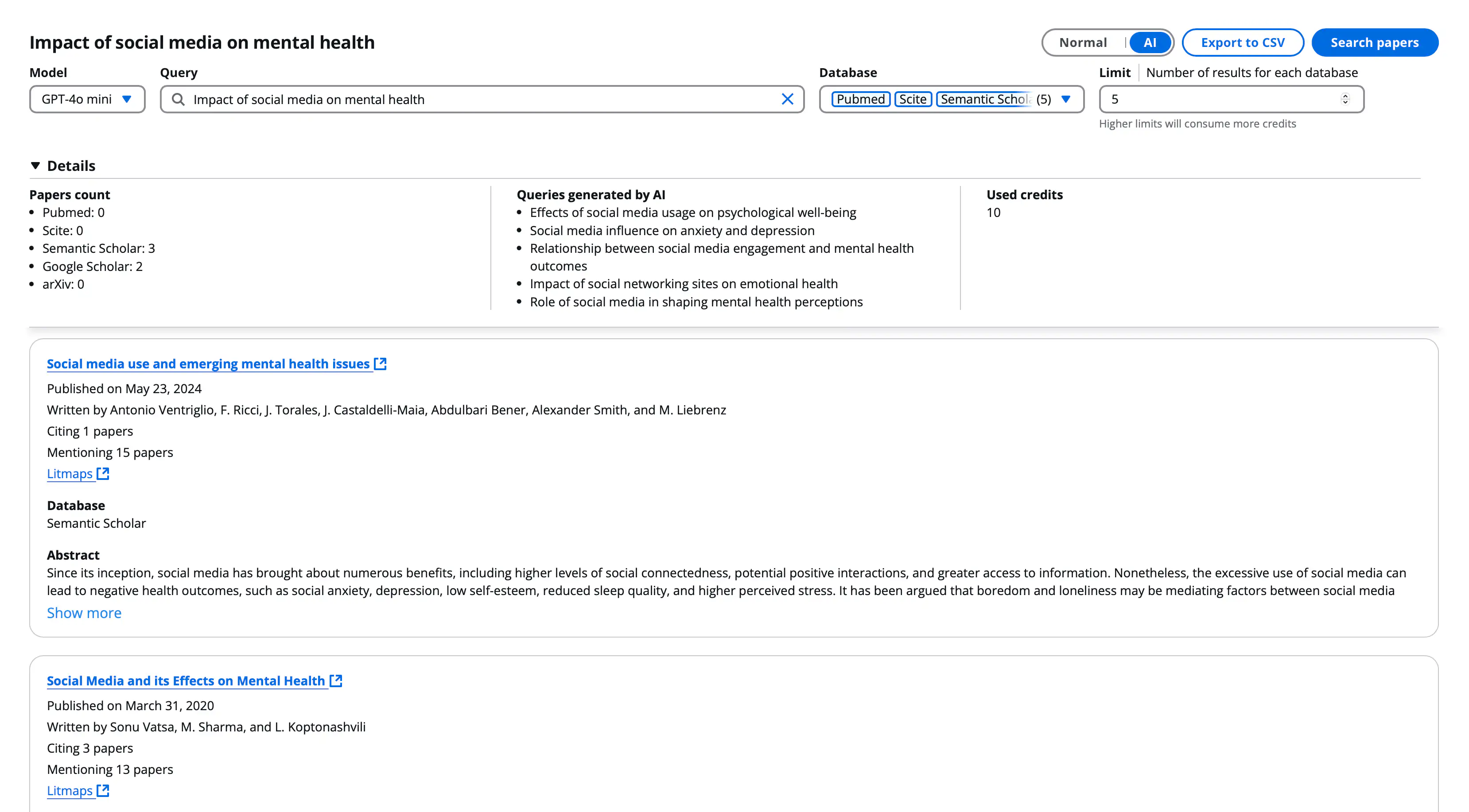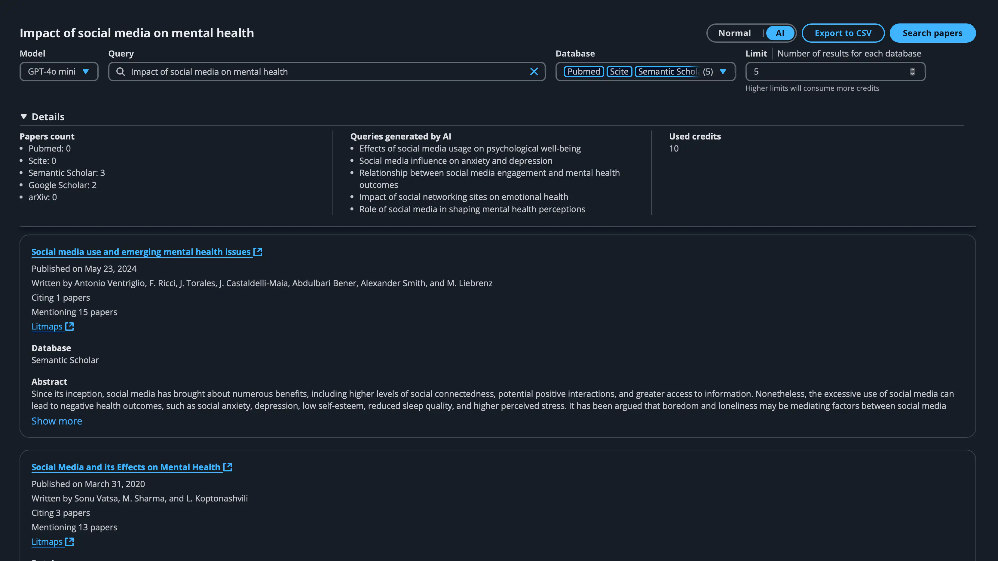 Search across millions of papers in Google Scholar, Semantic Scholar, PubMed, arXiv, ERIC, Europe PMC, OpenAlex with AI. Use Litmaps integration to generate graphs of relevant literature to enhance your literature review.